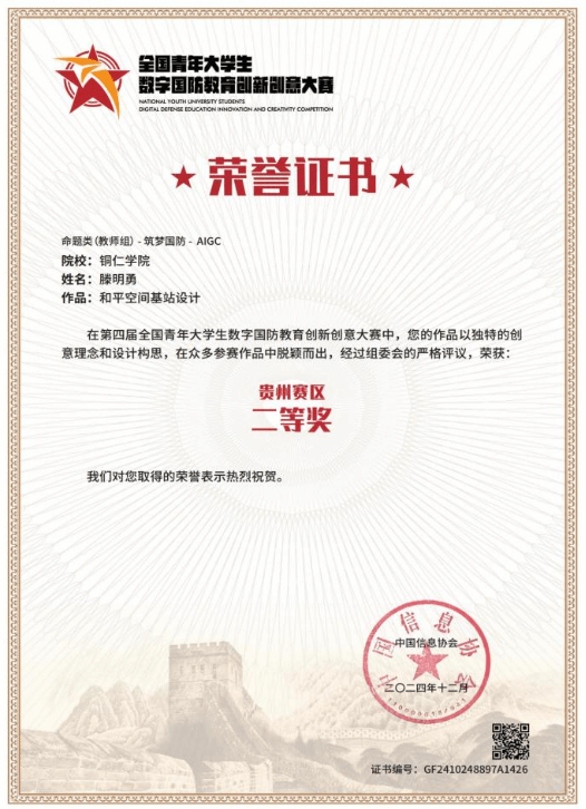 伟德官网艺术学院美术与设计系教师滕明勇教授,2024年在多项全国性设计竞赛中获奖。8月,滕明勇教授的设计作品《遇见·空间》《深蓝世界》《毕业影响》分别获得全国高校创新设计大赛组委会举办的“东方设计奖”一二三等奖。9月,设计作品《智联和平盾空间站设计》获得东方创意之星设计大赛组委会举办的东方创意之星主题设计赛三等奖。12月,两组设计作品《空天卫士系列》《和平空间基站设计》都获得中国信息协会举办的“全国青年大学生数字国防教育创新创意大赛”教师组贵州赛区二等奖,《空天卫士系列》部分作品还进入全国决赛并获得三等奖。