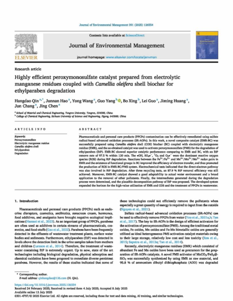 (1)将电解锰渣(EMR)与油茶壳生物炭(BC)进行复合,制备出EMR-BC复合催化剂,用于活化过硫酸盐降解水中的对羟基苯甲酸乙酯(EtP,常用于防腐剂和食品添加剂),结果表明EMR-BC复合催化剂的催化活性比EMR和BC均高,在最佳工艺条件下,反应120min,EtP的去除率高达97.5%。该研究对EMR-BC催化剂的活性位点进行了识别,并对过硫酸盐的活化机理进行了研究。该研究成果以“Highly efficient peroxymonosulfate catalyst prepared from electrolytic manganese residues coupled with Camellia oleifera shell biochar for ethylparaben degradation”为题发表于环境领域权威期刊Journal of Environmental Management(SCI二区top期刊)。