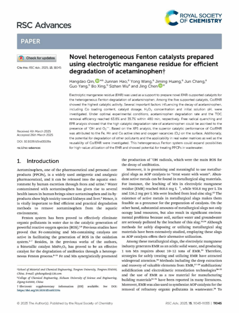 (2)将电解锰渣作为载体负载钴的氧化物制备出Co/EMR负载型催化剂,并将其用于非均相Fenton降解水中的对乙酰氨基酚(一种常见的止痛药),对体系中产生的活性氧物种进行了分析,并对催化机理进行了深入探讨。该研究成果以“Novel heterogeneous Fenton catalysts prepared using electrolytic manganese residue for efficient degradation of acetaminophen”为题发表于化学综合期刊RSC Advances。
