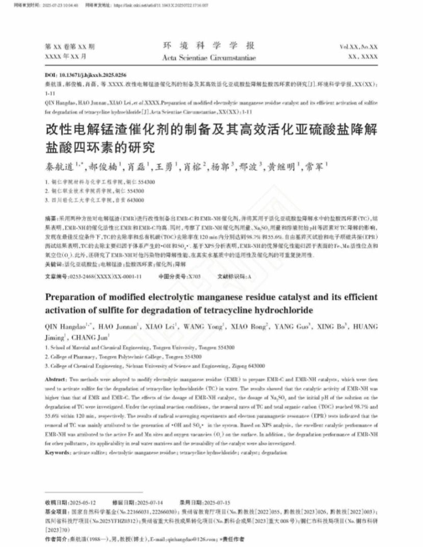 (3)直接对电解锰渣进行改性制备出EMR-NH催化剂,并将其用于活化亚硫酸盐降解水中的盐酸四环素(TC,一种常用于治疗细菌感染的抗生素),结果表明EMR-NH的催化活性比未改性的EMR高。在最佳反应条件下,TC的去除率和总有机碳(TOC)去除率在120 min内分别达到98.7%和55.6%。对EMR-NH催化剂的活性位点进行了识别,对体系中产生的活性氧物种进行了鉴定。此外,还研究了EMR-NH对其他污染物的降解性能、在真实水基质中的适用性以及催化剂的可重复使用性。该研究成果以“改性电解锰渣催化剂的制备及其高效活化亚硫酸盐降解盐酸四环素的研究”为题发表于核心期刊《环境科学学报》。