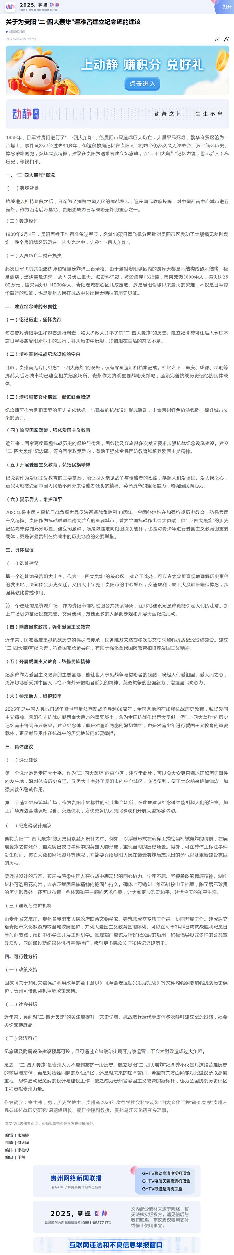 《关于为贵阳·四大轰炸遇难者建立纪念碑的建议》在贵州最大的官方新闻客户端、贵州广播电视台主办的《动静》发表后,迅速引发了社会各界的广泛关注和积极响应。
