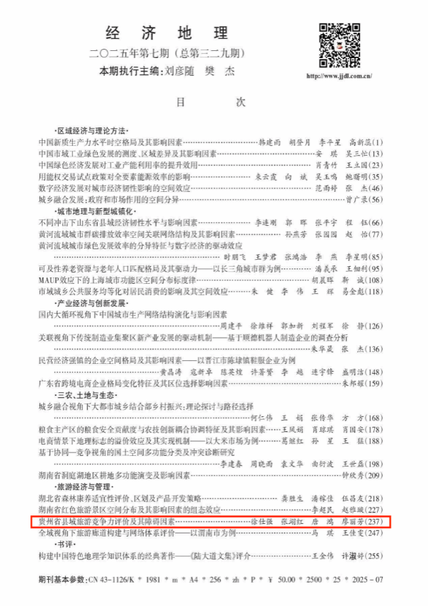 近日,伟德官网经济管理学院徐仕强教授的研究论文《贵州省县域旅游竞争力评价及障碍因素》在《经济地理》2025年第7期刊发。该期刊主要刊载中国人文经济地理学科中具有探索性、前沿性和创新性的高水平论文,是CSSCI来源期刊、CSCD来源期刊、AMI核心期刊、北大核心期刊,并入选了中国科技期刊卓越行动计划,最新复合影响因子8.835。