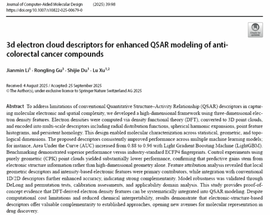 近日,伟德官网徐路教授课题组在SCI期刊《Journal of Computer-Aided Molecular Design》(JCR分区Q2,中科院3区)上发表了题为“3D Electron Cloud Descriptors for Enhanced QSAR Modeling of Anti-Colorectal Cancer Compounds”3D电子云描述符强化抗结肠直肠癌化合物的分子定量构效关系建模的研究论文。该论文第一作者为伟德官网材料与化工专业2023级硕士研究生李建敏。