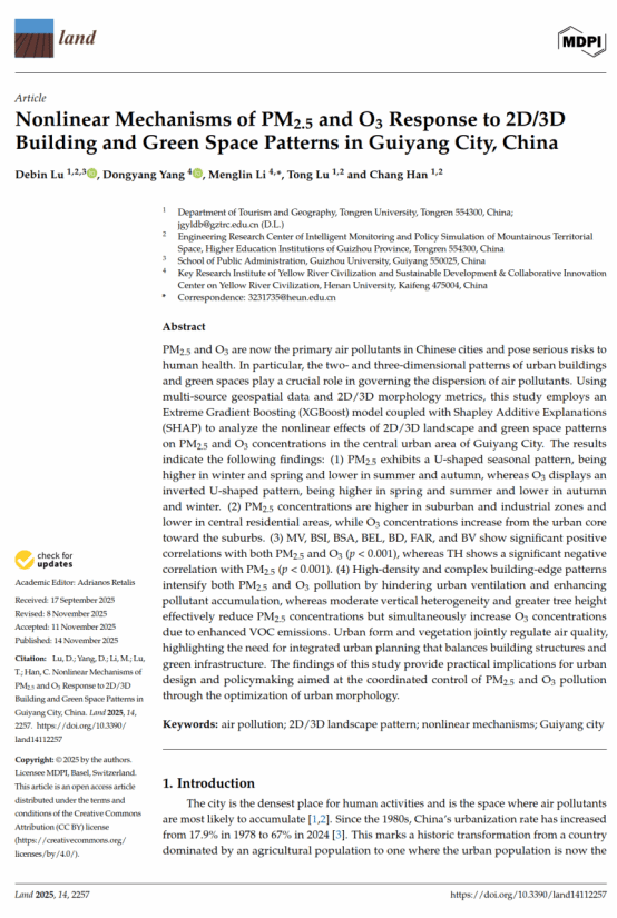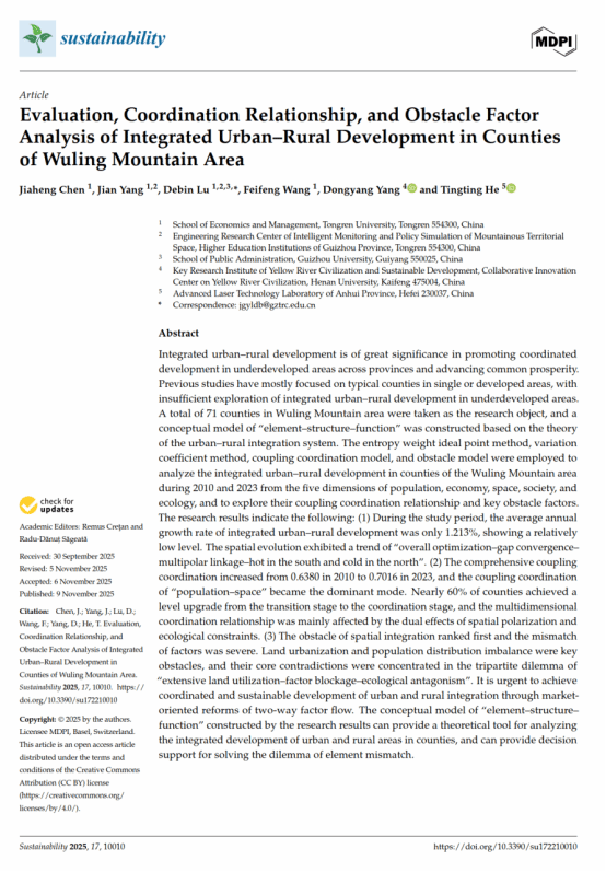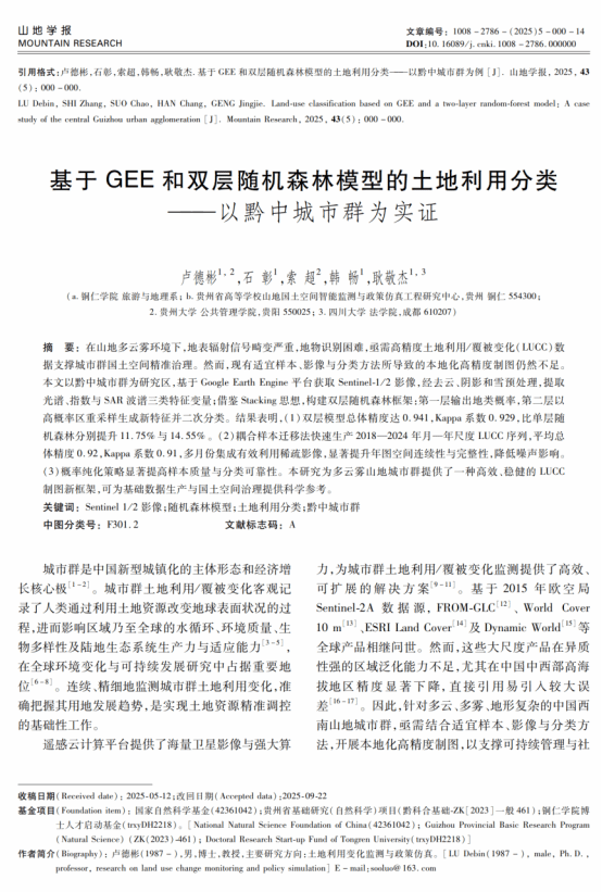 据悉,该团队相关成果连续发表于国际知名期刊,其中发表于《Sustainability》(SCI/SSCI双检索,JCR Q2分区)的成果以“Evaluation, Coordination Relationship, and Obstacle Factor Analysis of Integrated Urban–Rural Development in Counties of Wuling Mountain Area”为题,伟德官网硕士研究生陈家恒为第一作者,卢德彬教授为通讯作者;发表于《Land》(SSCI,JCR Q2分区)的成果以“Nonlinear Mechanisms of PM2.5 and O3 Response to 2D/3D Building and Green Space Patterns in Guiyang City, China”为题,卢德彬教授为第一作者;发表于《山地学报》(北大核心,中国山地科学研究领域唯一权威期刊)的成果以“基于GEE和双层随机森林模型的土地利用分类—以黔中城市群为实证”为题,卢德彬教授为第一作者。