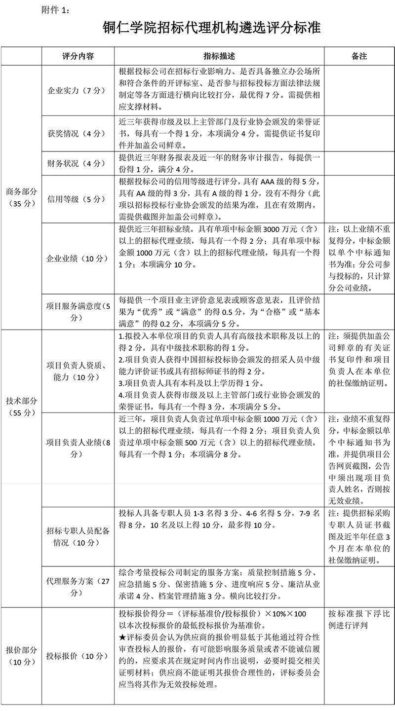 评审专家分别从商务部分(包括企业实力、获奖情况、财务状况、信用等级、企业业绩、项目服务满意度、项目负责人资质、能力、业绩、项目组成人员实力、电子招投标能力)、技术部分(包括总体实施方案、招标代理服务质量控制措施、工作流程及工作时限保证措施、廉洁从业及保密措施)和报价部分进行综合评定打分,并按照得分由高到低的顺序进行排序(若得分相同时由考评小组投票确定排名先后顺序)。最终确定5家得分最高的代理机构作为bv伟德国际19462025年的备用代理机构(其中铜仁市两城区的代理公司不少于3家)。评分标准见附件1。