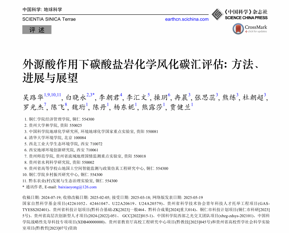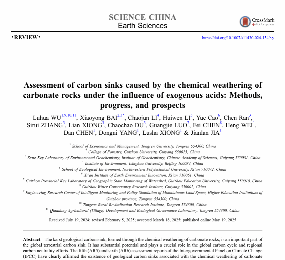 2025年5月19日,吴路华教授在国际权威期刊《Science China Earth Sciences》和《中国科学:地球科学》(中科院1区Top SCI,IF=6)同时在线发表题为《Assessment of carbon sinks caused by the chemical weathering of carbonate rocks under the influence of exogenous acids: Methods, progress, and prospects》与《外源酸作用下碳酸盐岩化学风化碳汇评估:方法、进展与展望》的2篇研究论文。该论文一刊双版(中文版与英文版),同时在线发表,吴路华教授为第一作者,中国科学院地球化学研究所白晓永研究员为通讯作者,联合贵州大学、清华大学、西北工业大学等多家科研机构共同完成。