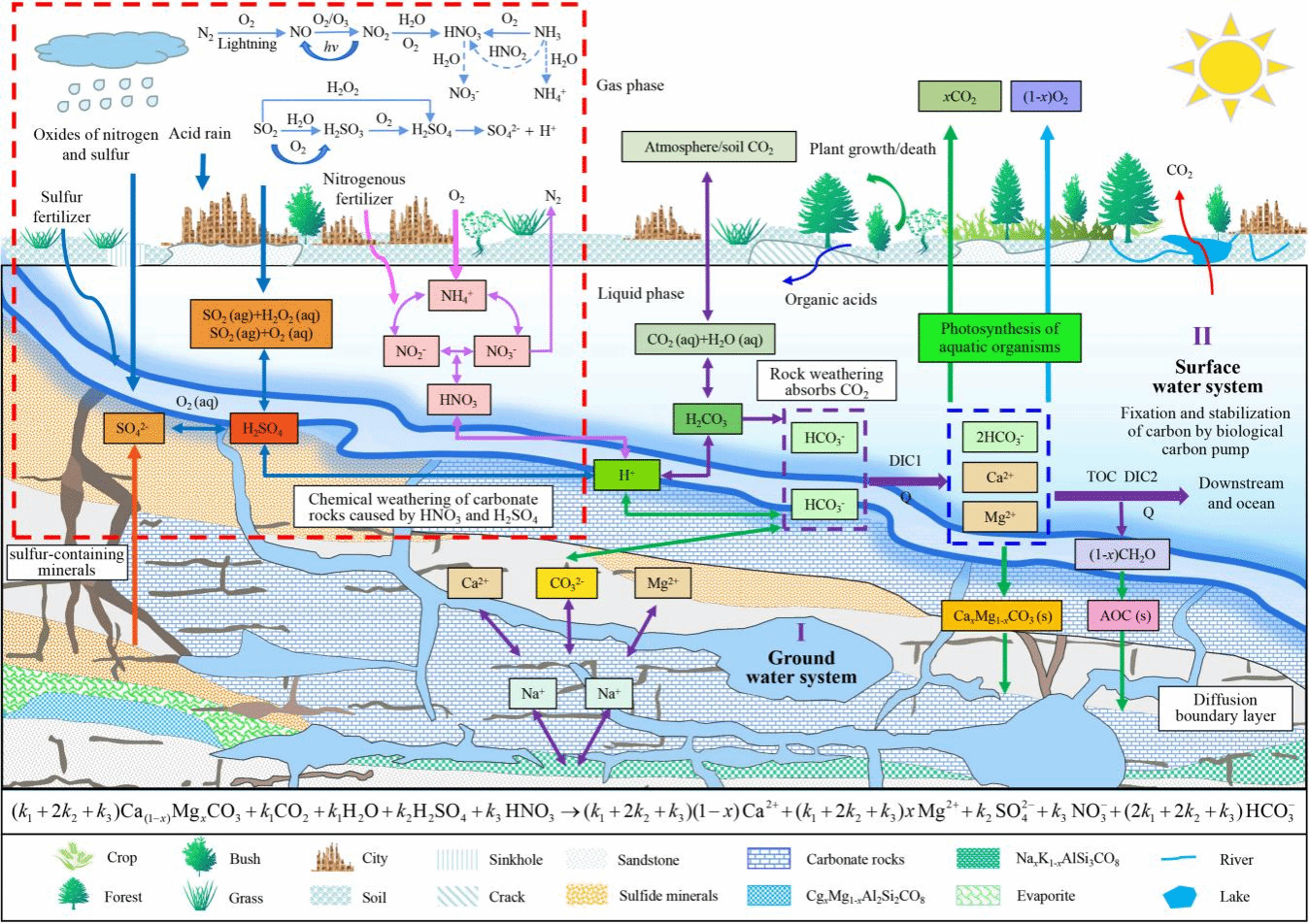 图1 HNO3、H2SO4和H2CO3混合影响与多源岩性背景下碳酸盐岩化学风化吸收大气/土壤CO2概念模型