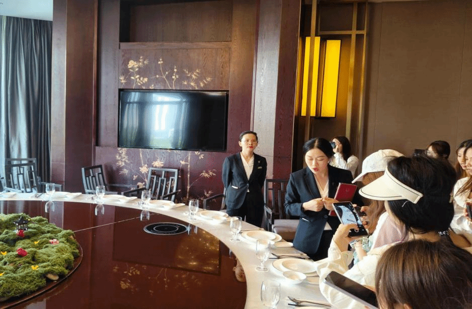 师生团队前往铜仁市国宾馆,深入前厅、客房、餐饮等部门,学习服务标准化流程,并参与客房布置、宴会设计等实操环节。