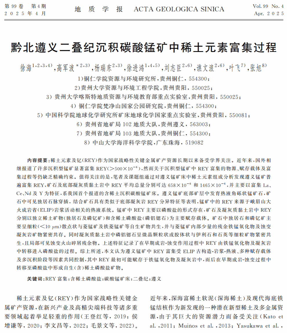 近期,我院徐海博士在卓越期刊《地质学报》发表研究论文《黔北遵义二叠纪沉积碳酸锰矿中稀土元素富集过程》。徐海博士为第一作者,贵州大学高军波教授为通讯作者。