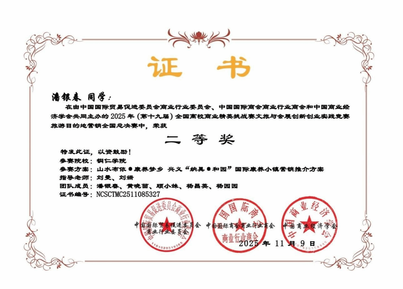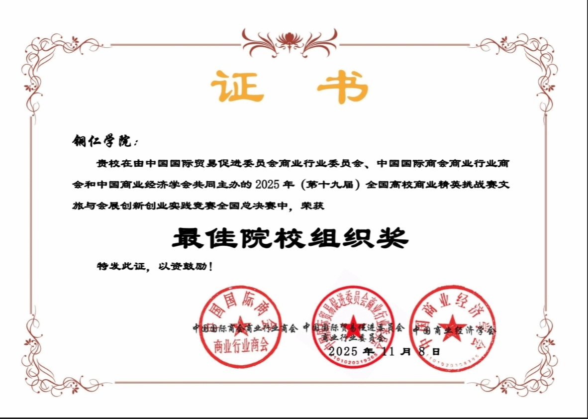近日,第十九届全国高校商业精英挑战赛文旅与会展创新创业实践竞赛全国总决赛圆满落幕。我院参赛团队表现优异,八支队伍全部获奖,斩获全国一等奖1项、二等奖1项、三等奖6项,并助力学校荣获最佳院校组织奖。