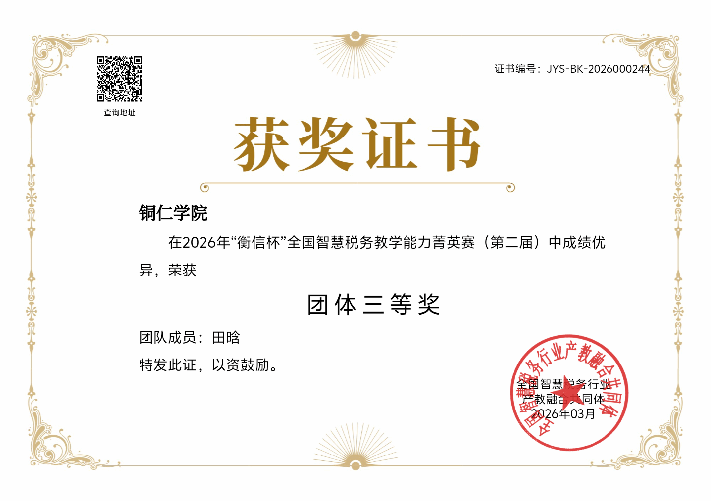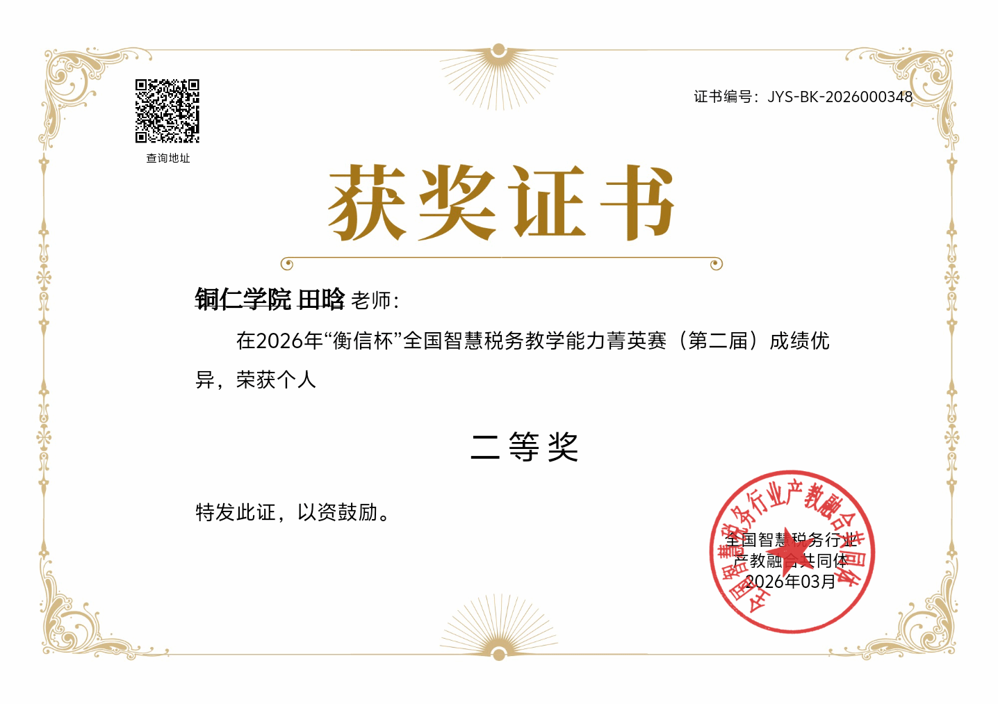 此次获奖,是田晗老师个人专业积累与教学实践的成果,也为我院在智慧税务教学领域的发展积累了有益经验。未来,我院将继续鼓励教师参与高水平教学交流活动,稳步提升教学能力与专业建设水平。