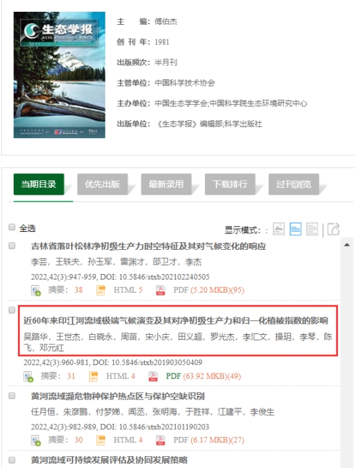 《生态学报》是由中国科学技术协会主管,中国生态学学会、中国科学院生态环境研究中心主办的生态学高级专业学术期刊,创刊于1981年。《生态学报》是生态学研究国内最大的学术交流平台。《生态学报》主要报道生态学及各分支学科的重要基础理论和应用研究的原始创新性科研成果;生态学新理论、新方法、新技术等。《生态学报》多项期刊评价指标稳居学科和全国前列,被引频次连续7年位居全国自然科学核心期刊第1名,是“中国百篇最具影响力优秀国内学术论文”刊载率最高的期刊,入选国家卓越期刊,国家一级学报,荣获国家省部级多种奖励,是我国一流的中文学术期刊。