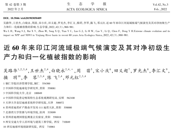近期,伟德官网经济管理学院吴路华副教授以第一作者在国家卓越期刊(bv伟德国际1946A类)《生态学报》2022年第3期发表论文《近60年来印江河流域极端气候演变及其对净初级生产力和归一化植被指数的影响》。