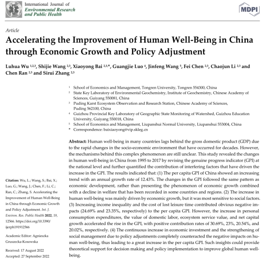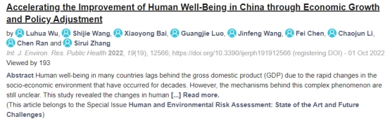论文主要信息如下:Wu, L.; Wang, S.; Bai, X.; uo, G.; Wang, J.; Chen, F.; Li, C.; Ran, C.; Zhang, S. Accelerating the Improvement of Human Well-Being in China through Economic Growth and Policy Adjustment. Int. J. Environ. Res. Public Health 2022, 19, 12566. https://doi.org/10.3390/ijerph191912566.
