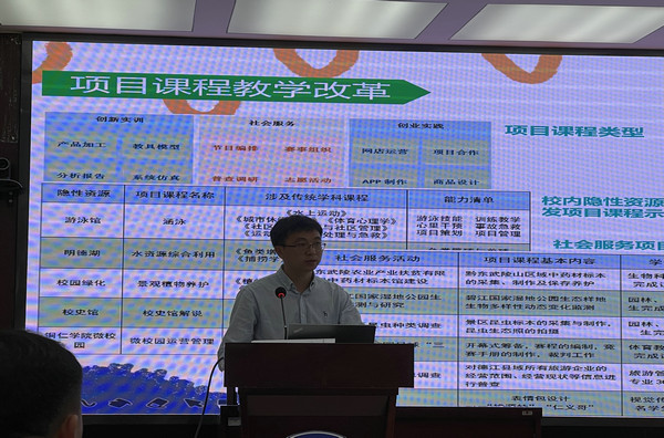 会上,教务处副处长冉耀宗从“项目课程的定义与内涵”、“如何准确理解项目课程”、“项目课程建设现状”、“下一步工作”四个方面对项目课程内涵进行了解读,同时根据现有的项目课程与经济管理学院、大数据学院、人文学院3个学院的老师进行了互动交流,现场讨论热烈,气氛活跃,充分交流项目课程建设心得,探讨解决项目课程金课建设过程中遇到困难和问题。