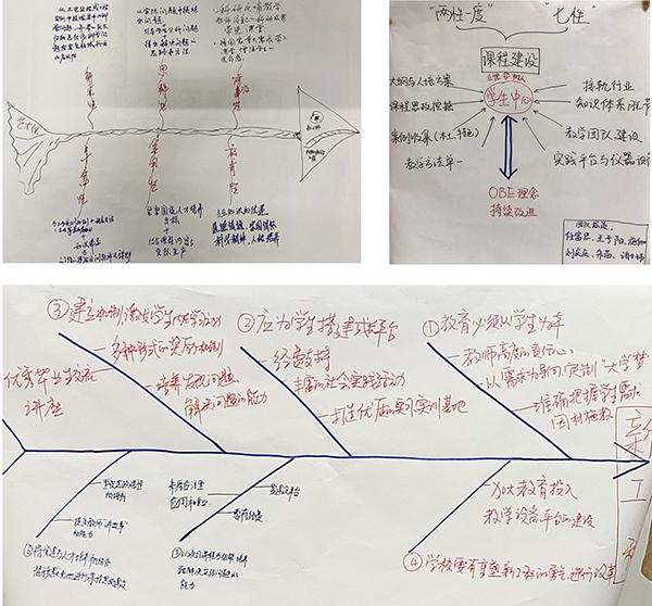 此次活动通过线上线下相结合的结构化研讨方式进行,材化学院教学督导组、金课建设组、金课申报组以及专业骨干教师组分别围绕“如何做好院级督导工作”“如何推进七性金课建设”“如何理解七性金课内涵”“在新工科背景下,结合专业特点和七性要求,阐述课程建设的思路”进行研讨。最后,各小组分别以鱼骨图或思维导图的方式呈现小组研讨结果,并在超星学习通平台进行了展示与汇报交流。
