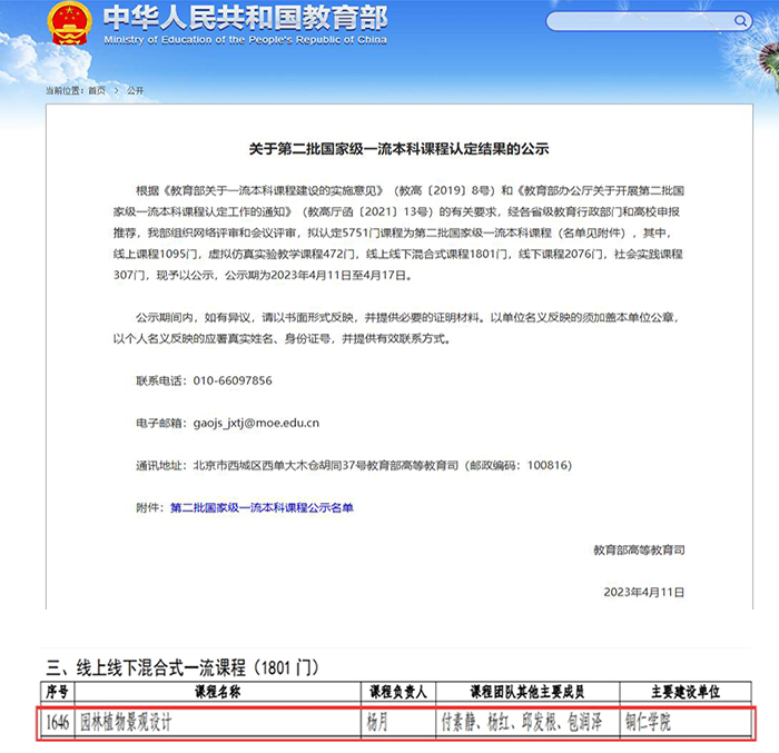 近日,教育部发布了《关于第二批国家级一流本科课程认定结果的公示》校农林工程与规划学院教师杨月、付素静、杨红、邱发根、包润泽、杨忠华团队负责的课程《园林植物景观设计》榜上有名这是我首次入围国家级一流本科课程。