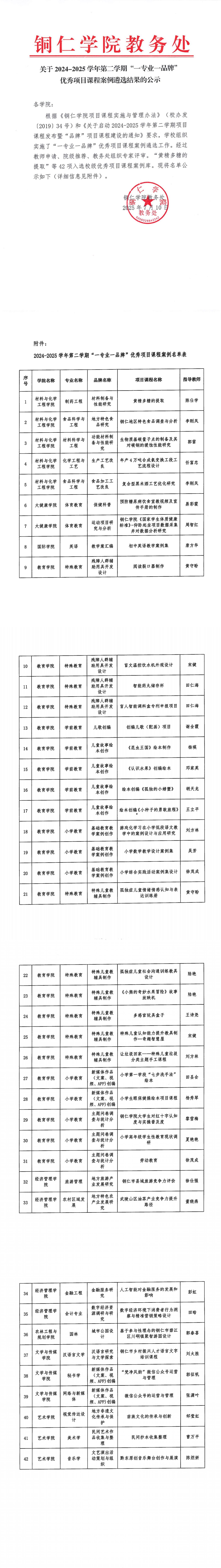 关于2024-2025学年第二学期“一专业一品牌” 优秀项目课程案例遴选结果的公示