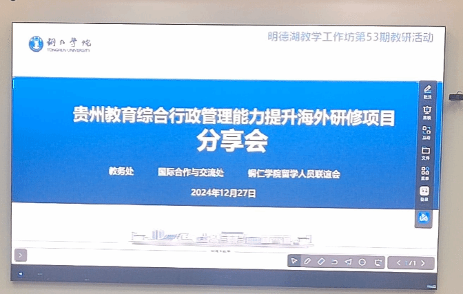 12月27日下午,伟德官网“明德湖”教学工作坊第53期活动在学科楼514智慧教室顺利举行。本期活动主题为“教育综合能力提升海外研修项目分享”,各专业负责人、骨干教师代表、bv伟德国际1946归侨侨眷联合会全体成员、bv伟德国际1946留学人员联谊会全体成员、教务处相关人员等30余人参加本次会议。活动由教务处处长孙向阳教授主持。