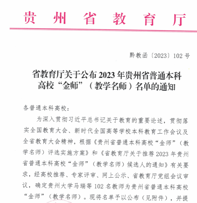 在2023年贵州省普通本科高校“金师”评选中,全省102名教师获评,其中伟德官网李刚凤、龙庆华2名教师上榜。