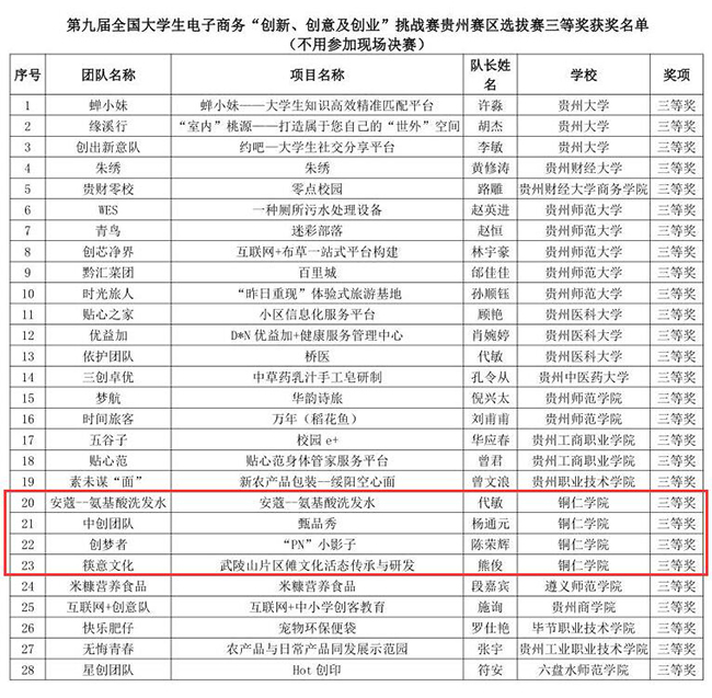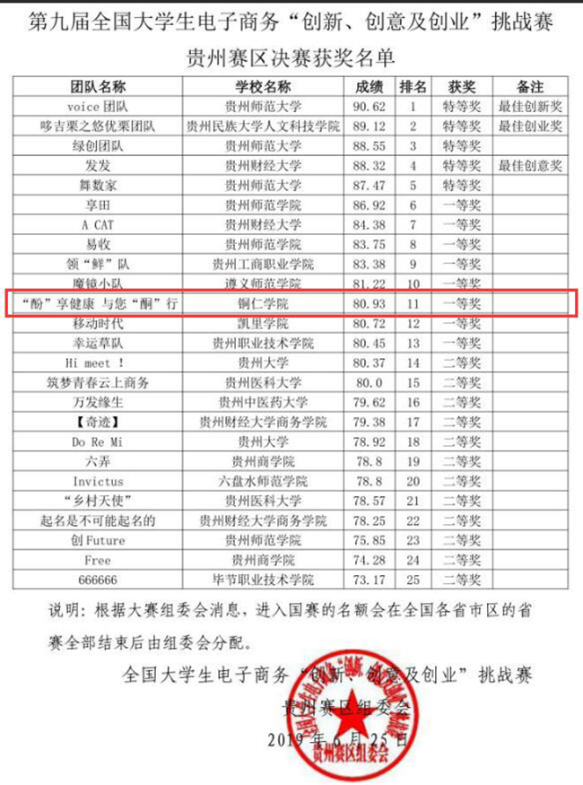 6月25日,贵州省教育厅公布了2019年第九届全国大学生电子商务“创新、创意及创业”挑战赛贵州赛区决赛获奖情况,伟德官网材料与化学工程学院“‘酚’享健康,与您‘酮’行”团队参与了决赛的现场答辩并在25支参赛队伍中荣获一等奖,经济与管理学院、大数据学院、材料与化学工程学院、艺术学院的4个项目团队获得了三等奖。