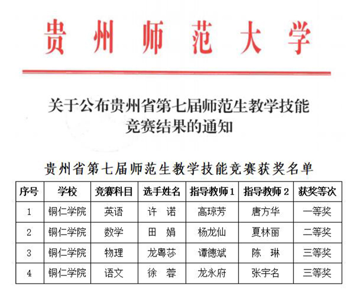 近日,贵州省第七届师范生教学技能竞赛在贵州师范大学举行,来自全省13所高校的200余名学生参加竞赛。本次竞赛设有语文、数学、英语等15个科目,伟德官网派出11名学生参加了11个科目的比赛。经过紧张角逐,伟德官网学生荣获一等奖1项,二等奖1项,三等奖2项。