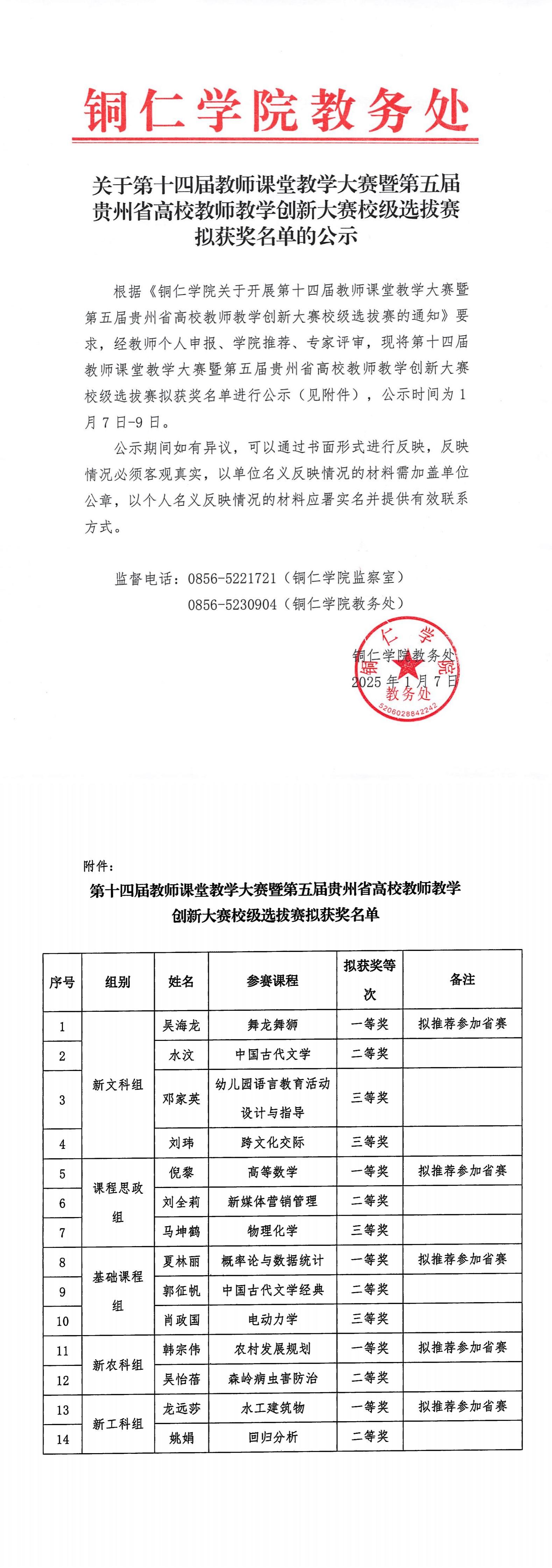 关于第十四届教师课堂教学大赛暨第五届贵州省高校教师教学创新大赛校级选拔赛获奖名单的公示