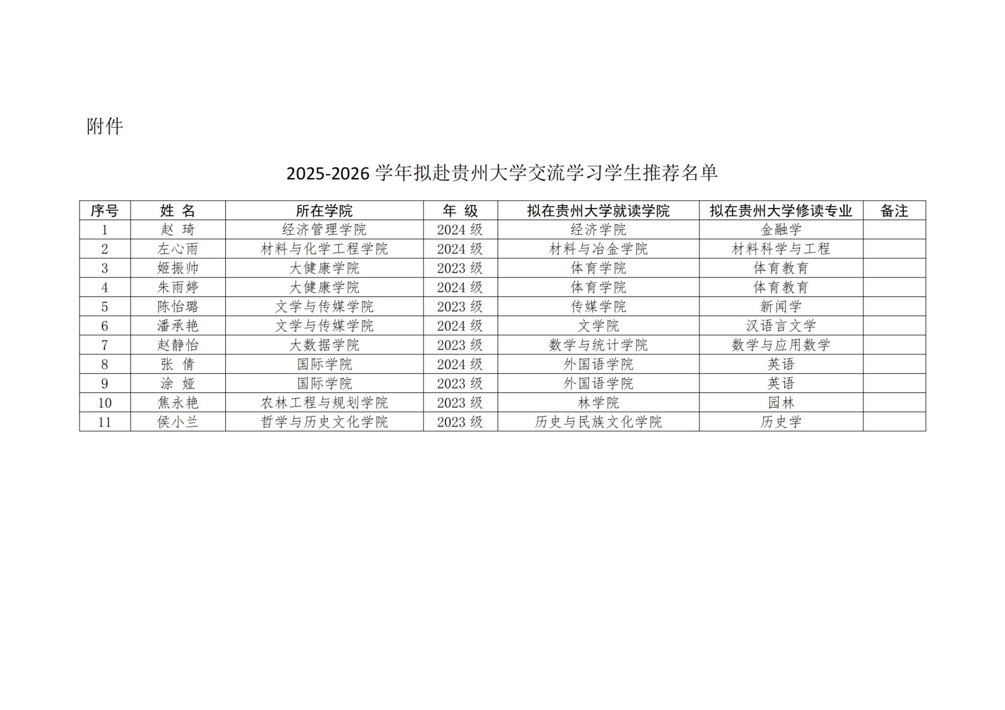 附件:2025-2026学年拟赴贵州大学交流学习学生推荐名单
