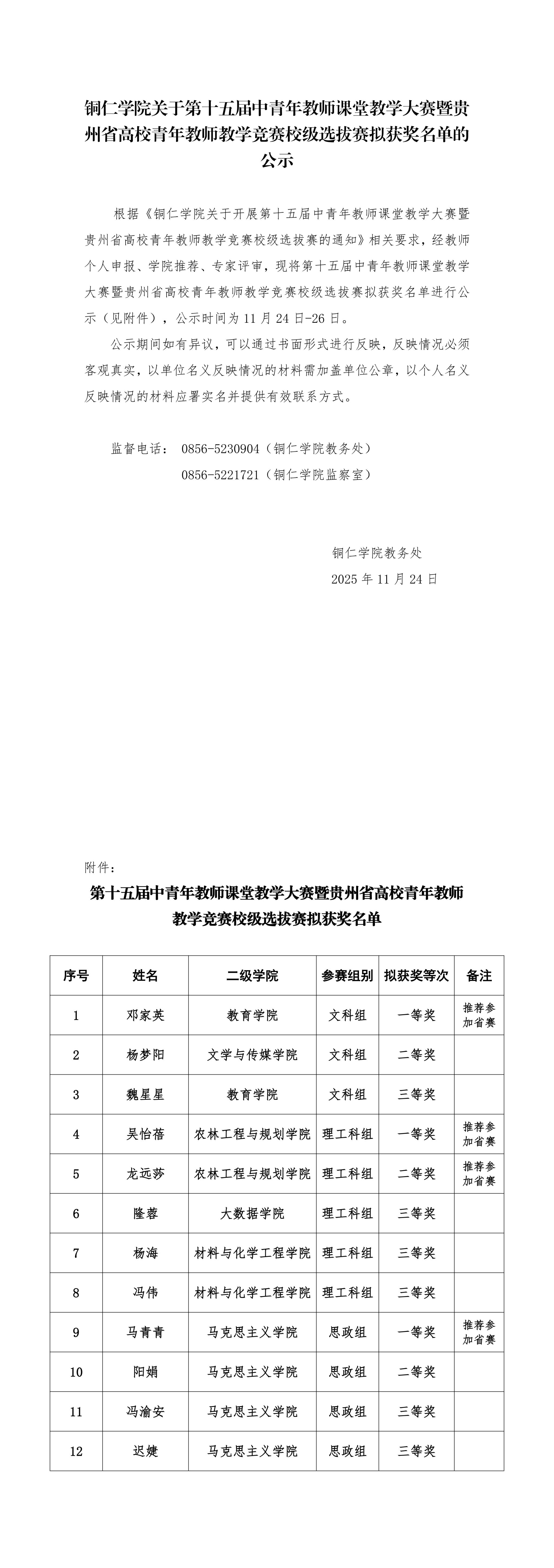 bv伟德国际1946关于第十五届中青年教师课堂教学大赛暨贵州省高校青年教师教学竞赛校级选拔赛拟获奖名单的公示