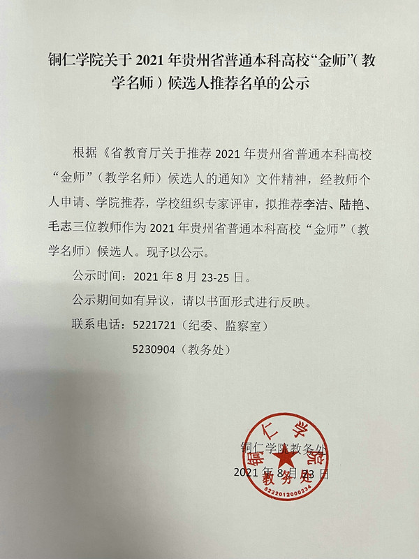 bv伟德国际1946关于2021年贵州省普通本科高校“金师”(教学名师)候选人推荐名单的公示