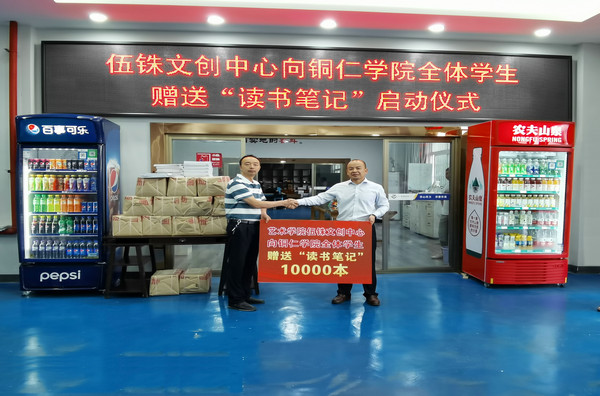 捐赠仪式上,刘飞向bv伟德国际1946全体学生赠送了“读书笔记”10000本,他希望同学们能利用读书笔记好好学习,立志成才,将来回报社会。冉茂武代表学校接受了笔记的捐赠,并对伍铢文创中心表示衷心的感谢。