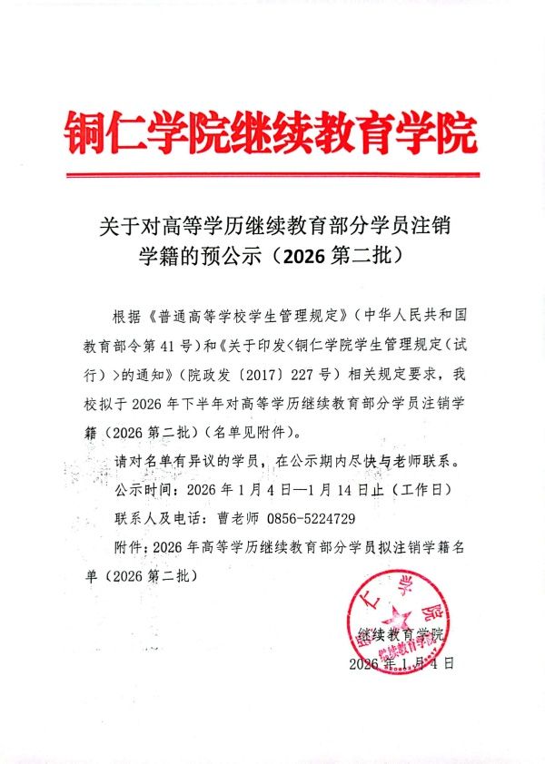 关于对高等学历继续教育部分学员注销学籍的预公示(2026第二批)