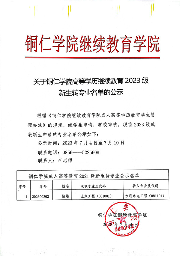 关于bv伟德国际1946高等学历继续教育2023级新生转专业名单的公示