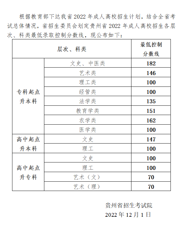 贵州省2022年成人高校招生最低录取控制分数线划定