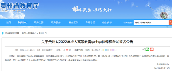 根据贵州省教育厅《关于贵州省2022年成人高等教育学士学位课程考试报名公告》的精神,贵州省2022年成人高等教育学士学位课程考试时间为:2022年3月27日上午9:00至11:00。网上报名时间:2021年12月1日上午8:00至2021年12月10日下午5:00结束,缴费时间:2021年12月13日上午8:00至2021年12月17日下午5:00结束,具体事宜请关注各考点官方网站。