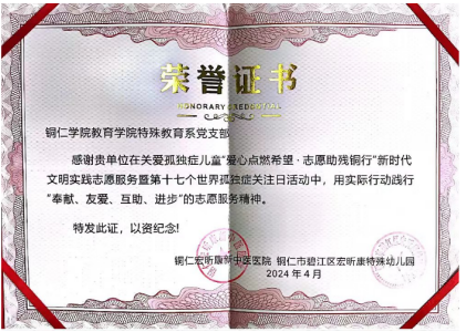 下午,教育学院特殊教育系党支部与铜仁宏昕康新中医医院开展了“爱心点燃希望·志愿助残铜行”新时代文明实践志愿服务活动。教育学院2022级、2023级特殊教育专业学生献上了精彩纷呈的节目,同时为参会师生与家长系上了代表关爱孤独症儿童的蓝丝带,并同孤独症儿童及家长们进行了有效互动。同时,党员代表陆艳同志接受了铜仁宏昕康新中医医院敬赠的bv伟德国际1946教育学院特殊教育系党支部志愿服务荣誉证书。