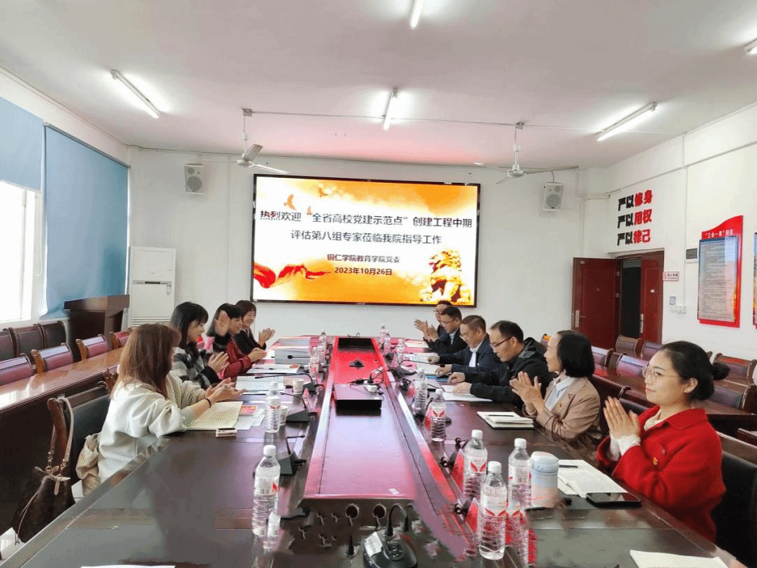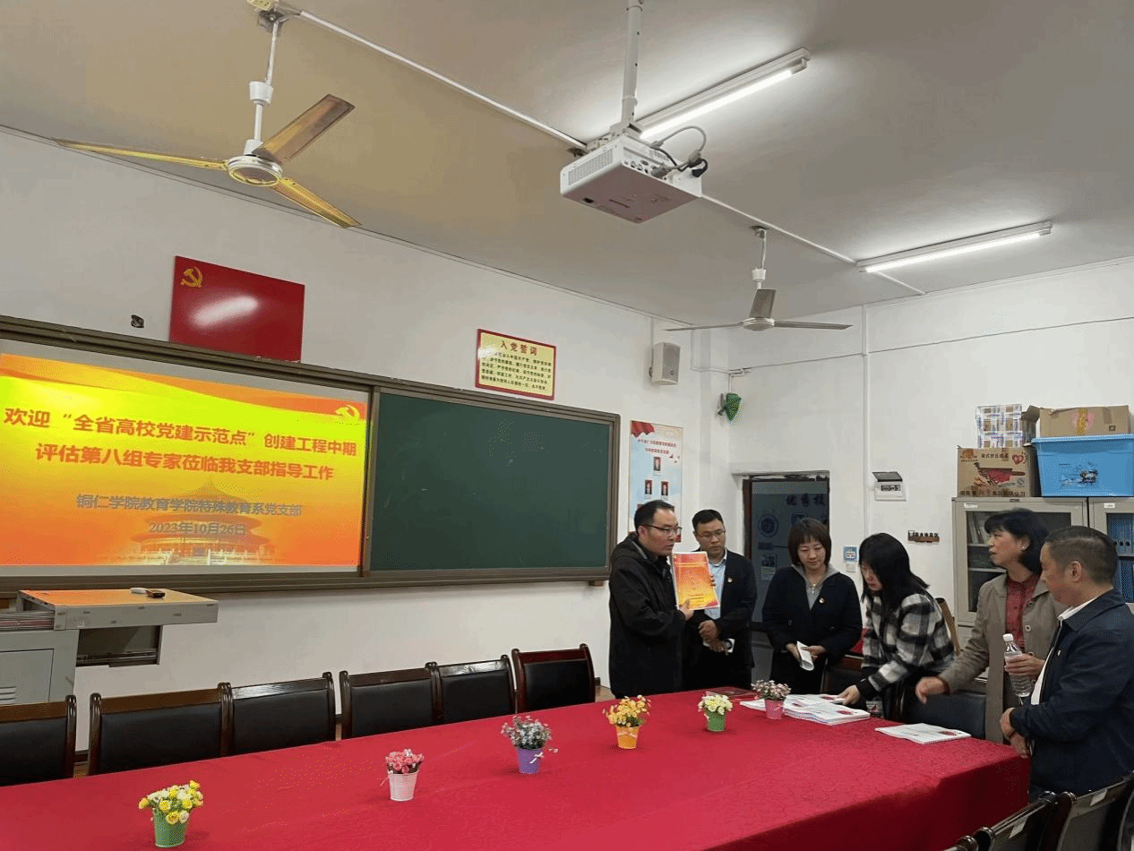 2023年10月26日,省委教育工委第八检查组到教育学院实地检查特殊教育系党支部“全省党建工作样板党支部”创建工程中期建设工作。省委教育工委第八检查组组长由贵州理工学院党委组织部副部长、机关党委书记王琳同志担任,检查组成员有贵州理工学院党委组织部何盈盈同志、何丹妮同志。bv伟德国际1946党委组织部副部长周慧娟同志,教育学院党委副书记吴承品同志,教育学院党委委员、党政办主任敖俊同志,特殊教育系党支部书记刘方林同志,基础教育系党支部书记杨秀琴同志,学生党支部组织委员谢焕庭同志,特殊教育系党支部全体党员同志及学生代表参加会议。会议由教育学院党委书记崔德虎同志主持。 座谈会上,首先播放了中共贵州省委宣传部“文艺精品”创作扶持重点项目成果《黔东红色组歌》视频;接着,崔德虎书记对专家组的莅临检查指导支部创建工作表示热烈欢迎,并简要介绍了教育学院党建工作开展情况。刘方林同志汇报了特殊教育系党支部省级样板党支部中期建设进展情况,他重点介绍了“党建引领下特殊教育专业医教结合‘1+3’服务育人”模式以及党支部“1451”党建工作机制。