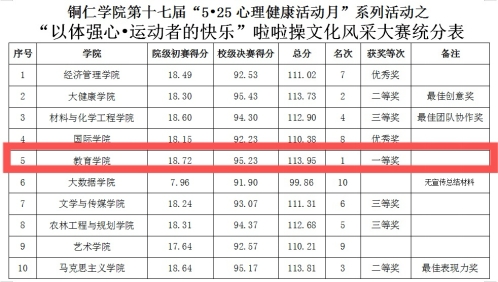 2024年5月24日下午,学校在运动场隆重举办第十七届“5•25心理健康活动月”啦啦操大赛,教育学院代表队最终以113.95的高分斩获一等奖。