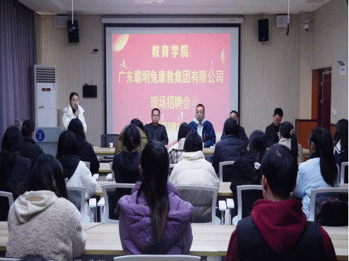 为扎实推进毕业生就业工作,搭建校企合作桥梁,2025年3月11日下午2时,教育学院与广东聪明兔康教集团有限公司联合主办的校园招聘会在明理楼B302教室顺利举行,教育学院党委书记崔德虎、学生科长左文及冯颖老师等全程参与活动。本次活动吸引了2021届特殊教育专业全体毕业生及部分学前教育专业学生参与,现场气氛热烈,成效显著。