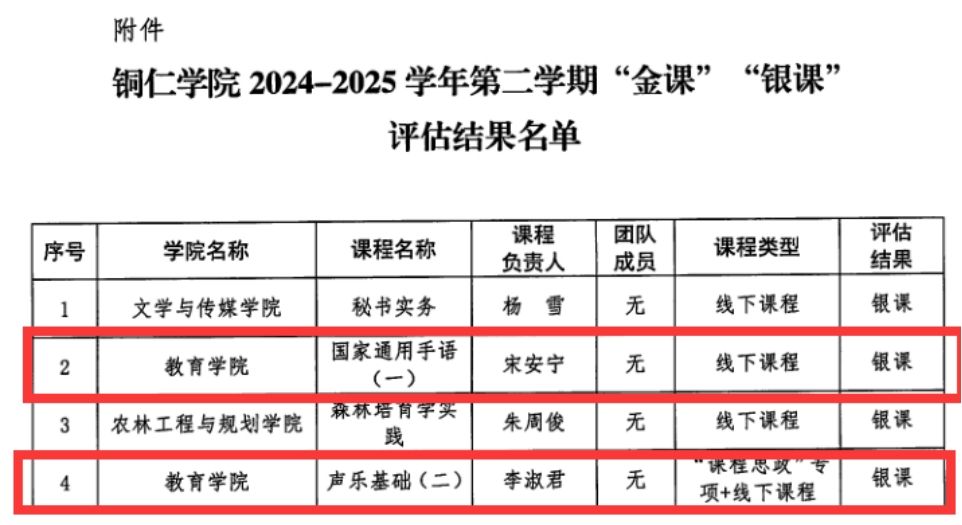 近日,bv伟德国际19462024-2025学年第二学期“金课”“银课”评估结果正式公布,教育学院再创佳绩,共有两门课程荣获“银课”称号,分别是《国家通用手语(一)》和《声乐基础(二)》。此次全校共评选出4门“银课”,教育学院占比50%,展现出学院在课程建设与教学质量提升方面的显著成效。