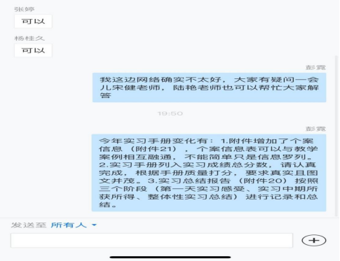 会议上,首先由彭霓副教授介绍会议流程,并传达实习期间需要完成的相关资料及表格的填写要求;其次,实习带队教师王老师作实习安排和要求,实习生要按时完成周日志和实习手册,以图文并茂的格式来记录周日志。还要求实习生听从实习学校的安排,顺利完成实习,并且强调了同学们的安全问题。小学教育专业与特殊教育专业召集人刘方林博士、教研室主任宋健博士做出补充,强调学生要遵守实习学校纪律,提高个人专业技能,培养各方面综合能力,以便更好的胜任实习工作。随后,专业负责人陆艳博士,详细讲解了毕业实习的相关问题,提醒同学们在实习过程中能全面兼顾,在实习期间将自己的毕业论文需要的数据能整理出来,祝愿同学们顺利完成毕业实习;最后,彭霓老师总结,提醒毕业生要完成实习协议书的相关规定。