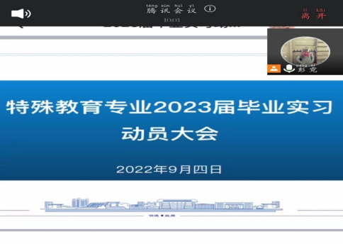 根据《bv伟德国际1946关于做好2023届本科生毕业实习工作的通知》的相关要求,为了顺利推进教育学院特殊教育专业2023届毕业实习工作,结合伟德官网疫情防控措施实际情况,特殊教育专业于2022年9月4日晚上通过腾讯会议在线召开了2023届毕业实习动员大会。参加此次会议的有特殊教育陆艳、刘方林、彭霓、宋健、王诗尧等老师,以及2019级特殊教育专业全体学生。