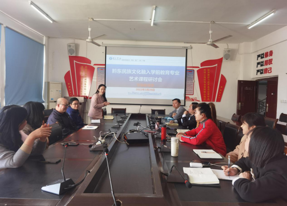 为提升学前教育专业艺术课程教学质量,凝练专业办学特色,3月28日,学前教育系在教育学院三楼会议室召开“黔东民族文化融入学前教育专业艺术课程”的专题研讨会,参加会议的人员有教育学院党委书记崔德虎,学前教育系主任杨瑛以及全体艺术课程教师。