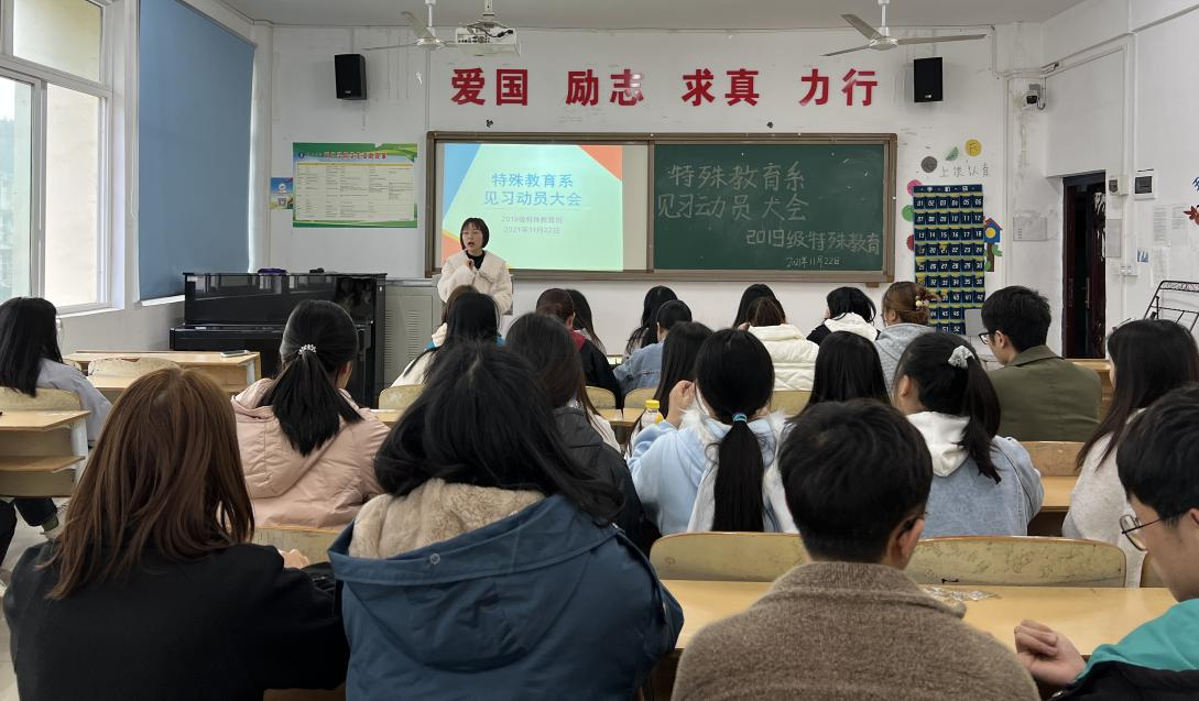 为了加强学生专业学习,培养学生实践能力,根据特殊教育专业人才培养方案及教育见习大纲要求,结合特殊教育专业本科课程安排以及专业发展需求,于11月22日晚在明理楼B306开展特殊教育系见习动员大会,参加本次活动的有特殊教育系系主任彭霓、专业教研室主任宋健博士、2019级特殊教育班全体学生。