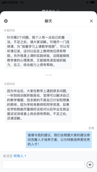 最后,陆艳博士就专家们提出的宝贵意见表示感谢,并承诺努力根据专家提出的建议进一步完善修订2020版特殊教育专业人才培养方案,争取给社会交上一份满意的答卷。田劲松副院长希望以后多召开此类推进会议,大家齐聚一堂,积极献言献策,在讨论中碰撞出新的思路、新的想法、新的格局,以此助推人才培养质量的提升。