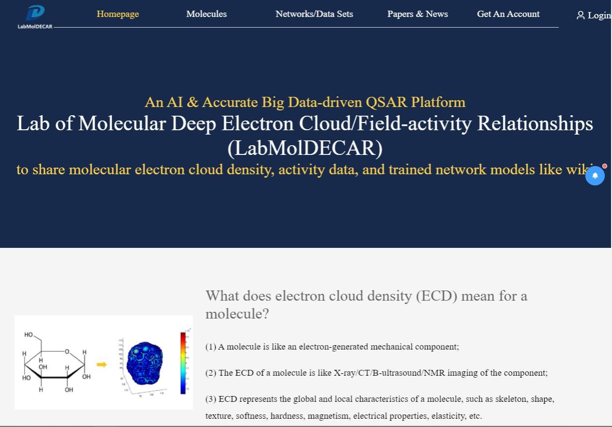 为了建立能够广泛预测各种分子的性质/活性的模型,近期,伟德官网大健康学院徐路博士的研究团队与长江大学物理与光电工程学院杨琴博士合作,基于AI、严格量子力学方法和大数据构建与分析,提出了深度电子云—活性关系(Deep Electron Cloud-activity Relationships, DECAR)和深度场—活性关系(Deep Field-activity Relationships, DFAR)的概念和方法。在此基础上,提出了构建由AI和精确大数据驱动的QSAR系统的构想,在理论上有望实现对一般分子的各种性质的可靠预测。LabMolDECAR相关数据库和研究平台的建设,正是实现上述构想的一个重要组成部分。