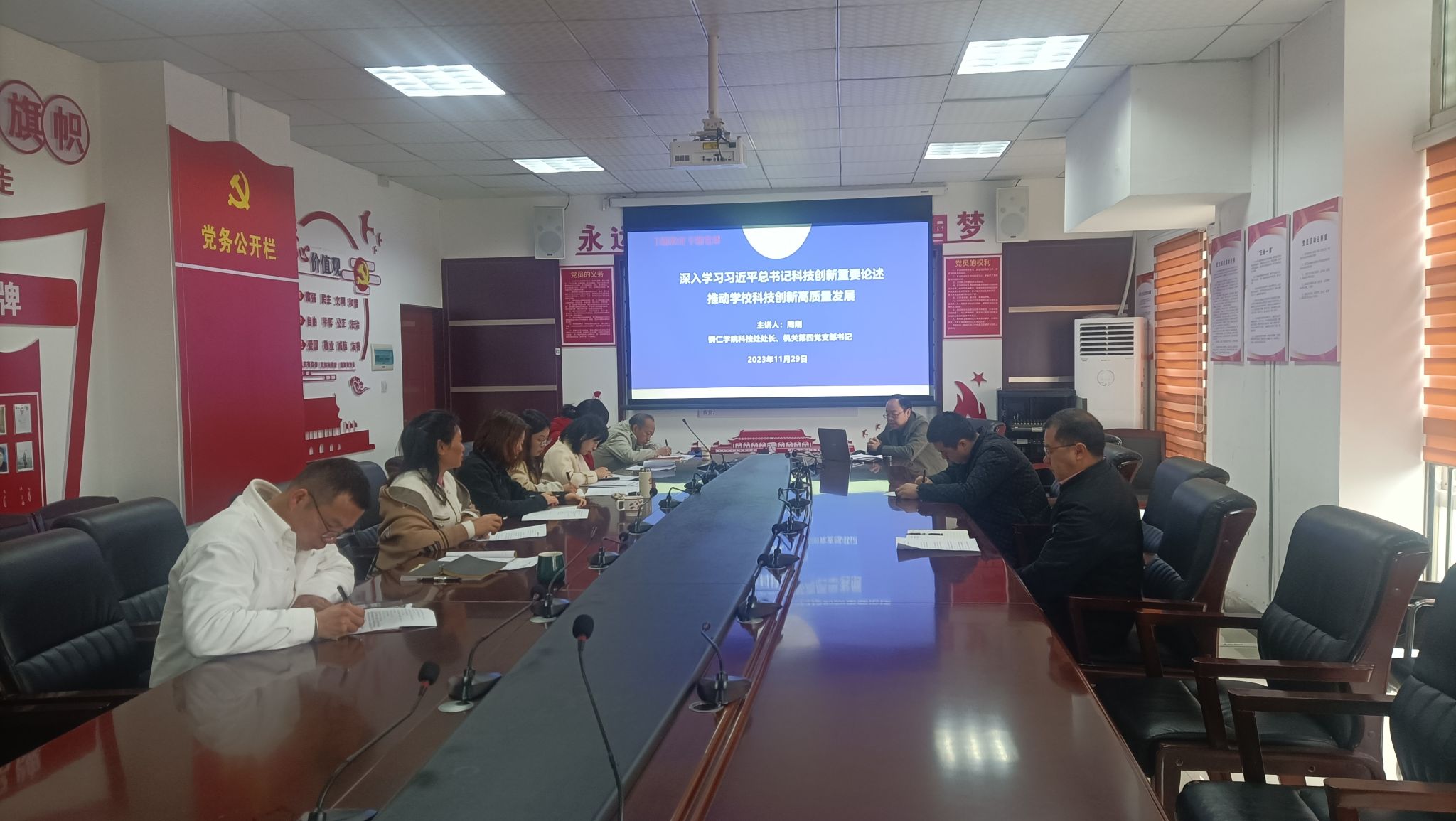 根据主题教育工作安排,11月30日上午,机关第四党支部书记、科技处处长周刚在行政楼8222会议室以“深入学习习近平总书记科技创新重要论述 推动学校科技创新高质量发展”为题,为科技处全体党员干部讲授主题教育专题党课。