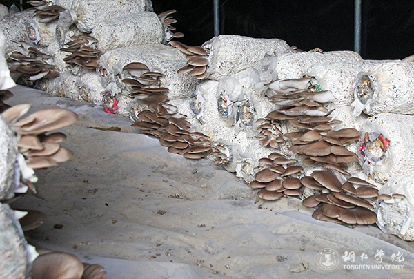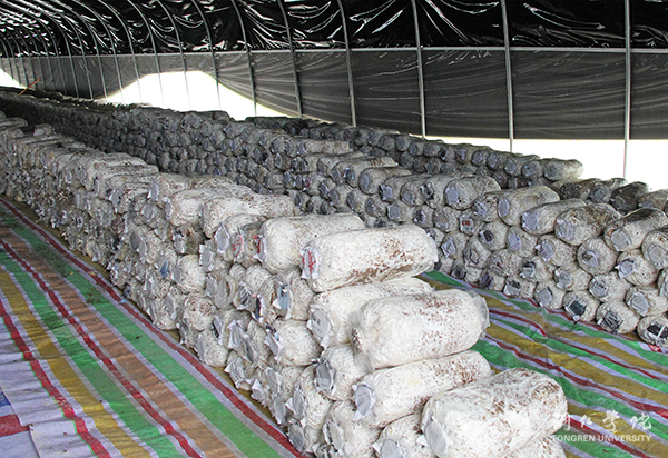 一个月前投放的在先试点的菌棒上长满了食用菌