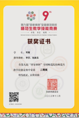 2023年12月31日,第九届“田家炳杯”全国师范院校师范生教学技能竞赛决赛在浙江师范大学落下帷幕。我院2021级思想政治教育专业邓菊同学凭借扎实的教学技能、优异的竞技状态和稳定的现场发挥以优异的成绩斩获高中学段思想政治教育组二等奖。