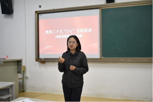 为了深入学习贯彻党的二十大精神,11月21日晚,我院在依仁楼A202教室举办了党的二十大“理论宣传二人讲”活动。参与此次活动的有2022级思想政治教育班辅导员陈伟华老师和该班全体同学,活动特邀全国“孝老爱亲”道德模范、中国青年五四奖章、贵州省道德模范、“铜城仁者”年度人物张蕾老师与同学们面对面学习交流党的二十大精神。